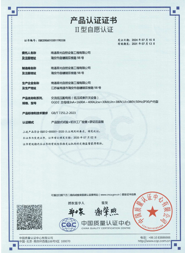 交流低壓配電柜認(rèn)證證書(shū)